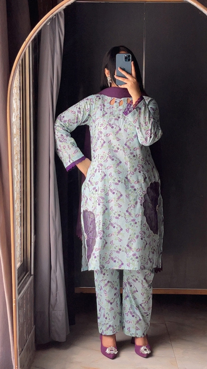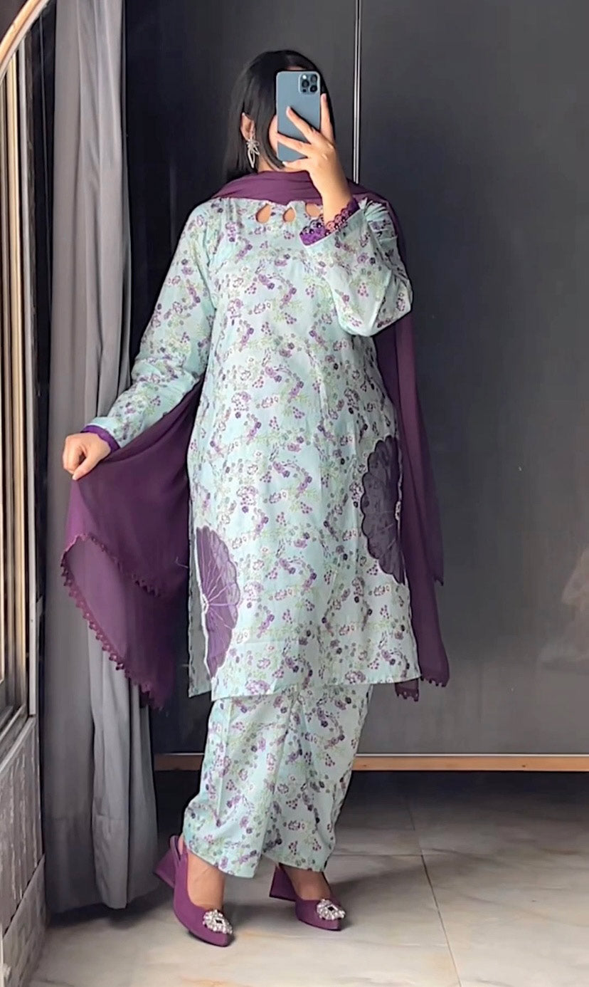 A beautiful fusion of grace and charm, this embroidered printed suit features a delicate floral pattern. It’s perfect for adding a pop of color to your everyday or semi-formal wardrobe.